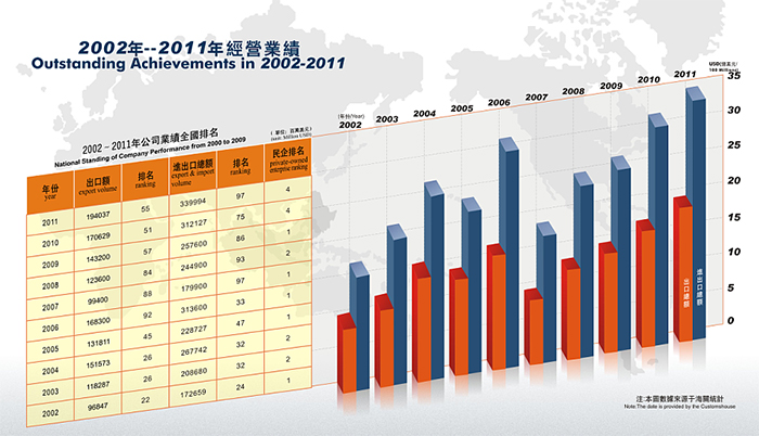 近年來,公司發(fā)展勢頭良好, 2014年公司實(shí)際出口額達(dá)到10.5億美金,排名“2014中國出口200強(qiáng)”第192名,其中民營企業(yè)排名第21名。公司先后獲得 “中國守合同重信用企業(yè)”、 “廣東省先進(jìn)集體”、“廣東省優(yōu)秀民營企業(yè)”、“東莞市50強(qiáng)民營企業(yè)”,“東莞市文明單位”等稱號(hào),公司被東莞市政府授予“東莞市50強(qiáng)民營服務(wù)業(yè)企業(yè)”光榮稱號(hào),公司董事長陳海生被授予“東莞市優(yōu)秀民營企業(yè)家”光榮稱號(hào)。